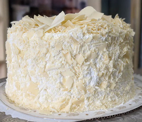 Vanilla Cake with 2 fillings of dark chocolate ganache. Iced with whipped cream, milk chocolate shaving on sides & white chocolate shavings on top.