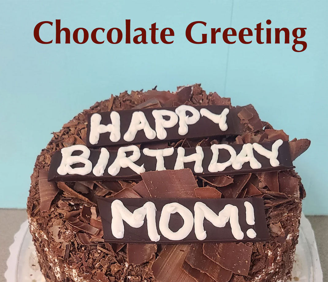Three layers of rich chocolate cake filled with light chocolate mousse and whipped cream. Iced with whipped cream and topped with milk chocolate shavings. White chocolate shavings are available upon request (not available on small rectangle size).